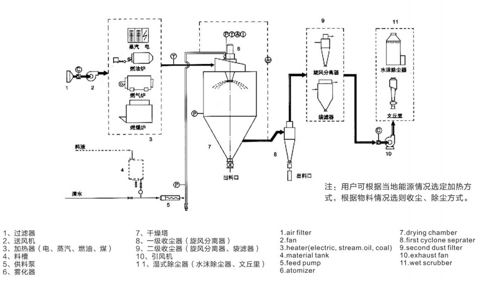 噴霧干燥機為開式循環(huán),并流式,離心式霧化。干燥介質(zhì)空氣經(jīng)過初、中效空氣過濾器過濾后根據(jù)操作指令由鼓風(fēng)機吸取再經(jīng)加熱器加熱通過高效過濾器的熱風(fēng)分配器進入噴霧干燥主塔。液體物料根據(jù)操作指令經(jīng)過蠕動泵,進入高速旋轉(zhuǎn)的離心噴頭,在離心力作用下被分散成小霧滴。在噴霧干燥主塔內(nèi),小霧滴與熱風(fēng)在充分接觸,沿其特定路徑進行熱交換后被干燥成為產(chǎn)品,然后通過旋風(fēng)分離器實現(xiàn)分離,固體物料被收集,氣體介質(zhì)再經(jīng)過過濾后被排出。整套噴霧系統(tǒng)易清潔、無死角,符合GMP要求。