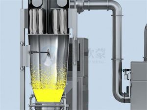 空氣經加熱凈化后,由引風機從下部導入,穿過料斗的孔網板。在工作室內,經攪拌和負壓作用形成流態化,水份快速蒸發后隨著排氣帶走,物料快速干燥。