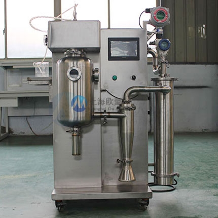 首先在開啟風機,加熱模塊,干燥塔體內充入氮氣,要被干燥的液態物料經輸液泵輸送至噴頭處,液態物料被霧化器霧化成細小液滴,液滴在干燥塔內與熱氮氣進行充分的熱交換,物料中的液態部分被瞬間蒸發,固態部分形成的粉狀物料沉于塔底,*后經過旋風分離器進行氣固分離至物料收集瓶,溶劑經過冷凝器回收,氣體循環利用。